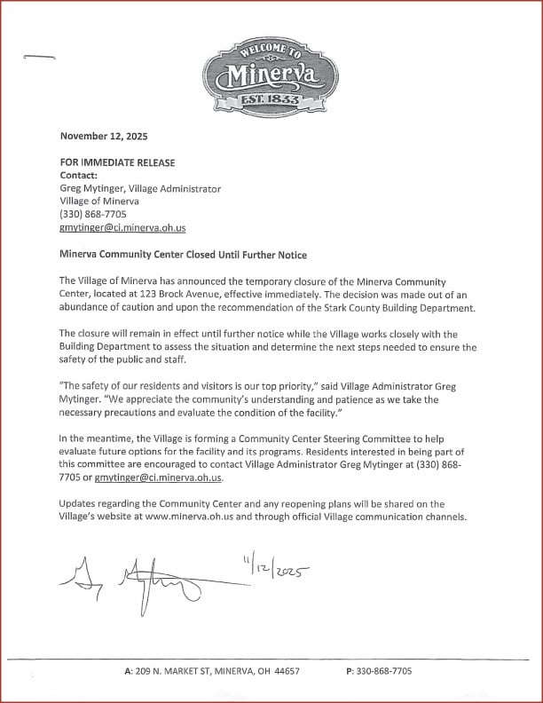 Any questions or concerns, contact Village of Minerva at (330) 868-7705 ext. 106.