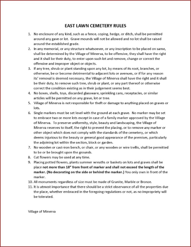 The Cemetery Department is responsible for the overall operation of 2 municipal cemeteries within the Village of Minerva.