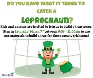 The Minerva Public Library is inviting kids and parents to put their creativity to the test! Stop in on Saturday, March 7th between 9-11 a.m. to build your very own leprechaun trap using materials provided by the library.