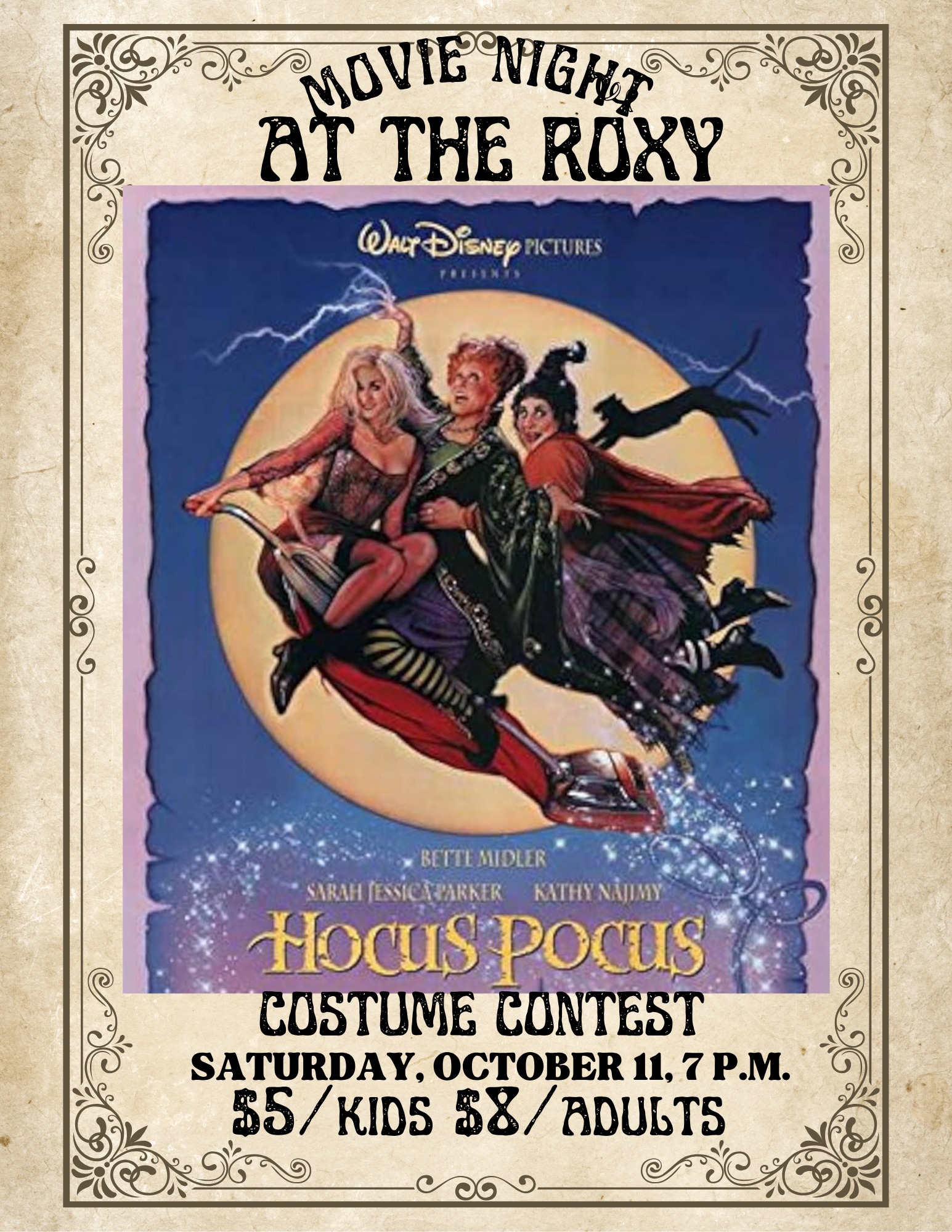 Join the Roxy Theatre on Saturday, October 11 at 7 p.m. for a showing of Hocus Pocus. Plan a whole evening of fun as a costume contest will be presented prior to the showing of the film. Dress as your favorite Sanderson sister or any other character from the movie for your chance to win a prize. There will be a group winner as well as an individual winner.